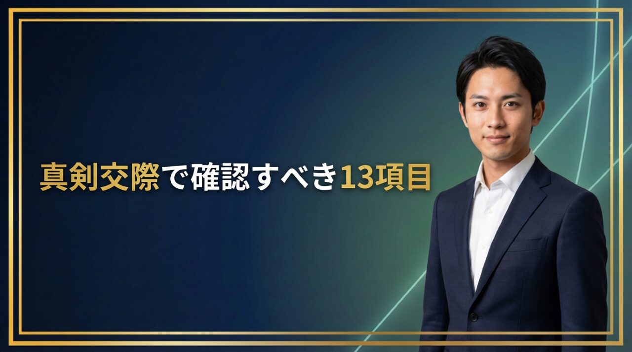 今回は、僕が今の妻と成婚退会する直前に、「これだけは絶対に握っておかなければならない」と確信した13の確認項目をまとめました。このチェックを終えたとき、あなたの不安は「この人と生きていく」という確固たる自信に変わっているはずです。