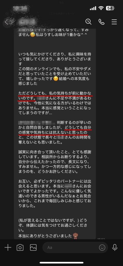 相談所では通常、理由もわからず一方的な「終了通知」が届くだけです。しかしその時、お相手の女性はLINEで、僕の何が足りなかったのかを丁寧に伝えてくれました。